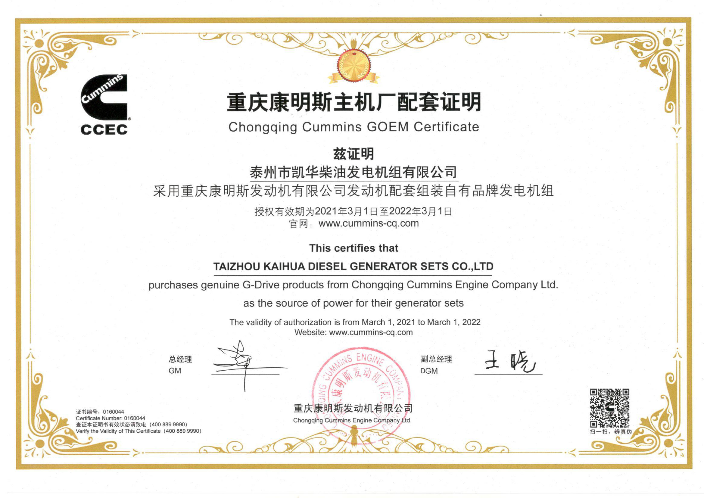 公司主營產品:3~3000KW陸用柴油發電機組,15~600KW移動拖車電站,12~1000KW船用應急柴油發電機組,各種靜音型、中高壓、多機并聯、燃氣等特種機組以及進口系列柴油發電機組,可滿足不同客戶的一切電力需求,還可滿足用戶不同電壓、不同頻率的要求。凱華公司是康明斯品牌的授權代理商,專業生產供應康明斯柴油發電機組。